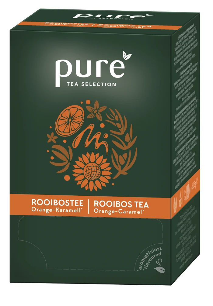 Pure Tea Selection – odpočiňte si od všednosti a objevte skutečnou krásu malých věcí v životě. Náš čaj rooibos je přirozeně bez obsahu kofeinu. Je obohacen jemnými aromaty karamelu a pomeranče a zve vás k vychutnání cesty pod jihoafrickým sluncem kdykoli během dne. Vychutnejte si naši intenzivní směs v ekologické síťovém sáčku.