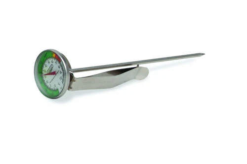 Barvy na teploměru rozlišují teplotu a tím připomínají doporučenou teplotu mléka 145 ° F / 62,7 ° C.